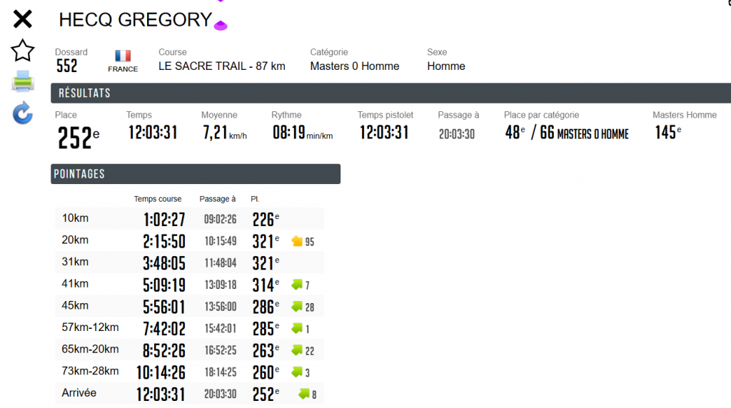 Bingo, il franchira la ligne après 12h03 d’efforts, se permettant « une cabriole » en passant l’arrivée. L’émotion était palpable sur son visage, mélangeant joie et l’amertume de c’est fini ». Grégory ne cachera pas qu’il a savourer ce côté long de la course. « Il a passé l’arrivée fatigué mais pas marqué » a souligné Olivier qui lui « tire son chapeau bas ». Deux jours après, Grégory a repris le travail sans vraiment de douleur et conclu « on ne dirait pas que j’ai fait cette distance ».