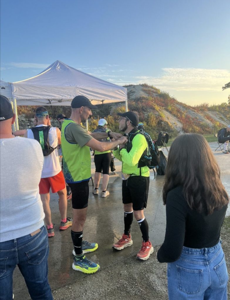 2025 sera une année mémorable pour Grégory Hecq. Ex pilote de moto-cross, moins de 2 ans après sa prise de licence à CAP 21, Grégory aura parcouru beaucoup de chemin. Abandonné, renoncé, hésité… ne font pas parti de son vocabulaire, par contre ténacité, dépassement de soi, recherche de limites sont les leitmotivs de notre capien. Et donc tout naturellement, il a été très vite attiré par les longues distances « une spécialité du club ». 1h39 en footing à Liesse-Marle pour préparer son 1er marathon, et pas le plus facile, à Parfondeval. Une vielle douleur au genou perturbe sa fin de préparation mais n’est pas Grégory qui veut. Il terminera le marathon en 4h09 quasi en pleurs à la limite de pouvoir poser le pied à terre. S’en suivra une opération du genou suivi d’une rééducation avec une grande place pour le vélo. Du coup, il s’essaie au triathlon, passant rapidement du S au M. Cette fois c’est sur l’Ultra Trail qu’il se lance, accompagné de son coach Olivier. Les longs récits de ce dernier à propos de ses 100 km et ultratrails ne sont certainement pas étranger à la situation tellement Grégory était captivé par les anecdotes. Avec une préparation express, à chaque sortie, il apprend un peu plus les spécificités de la discipline et la rigueur nécessaire dans la gestion de l’effort et l’alimentation.